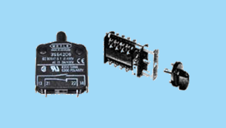 Miniature open type position switches can be used in applications such as automatic control functions and automatic door interlocking. 3SE4105 and 3SE4145 versions have direct opening action to DIN VDE 0113/ 2.86 and Publications 204-1 and 2. The NC contact is mechanically forced open by the plunger if the contact is slightly welded. Contact arrangements include 1 NO, 1 NC, 1 NC + 1 NC and 2 NO (slow action only). Contacts are of the bridge construction.